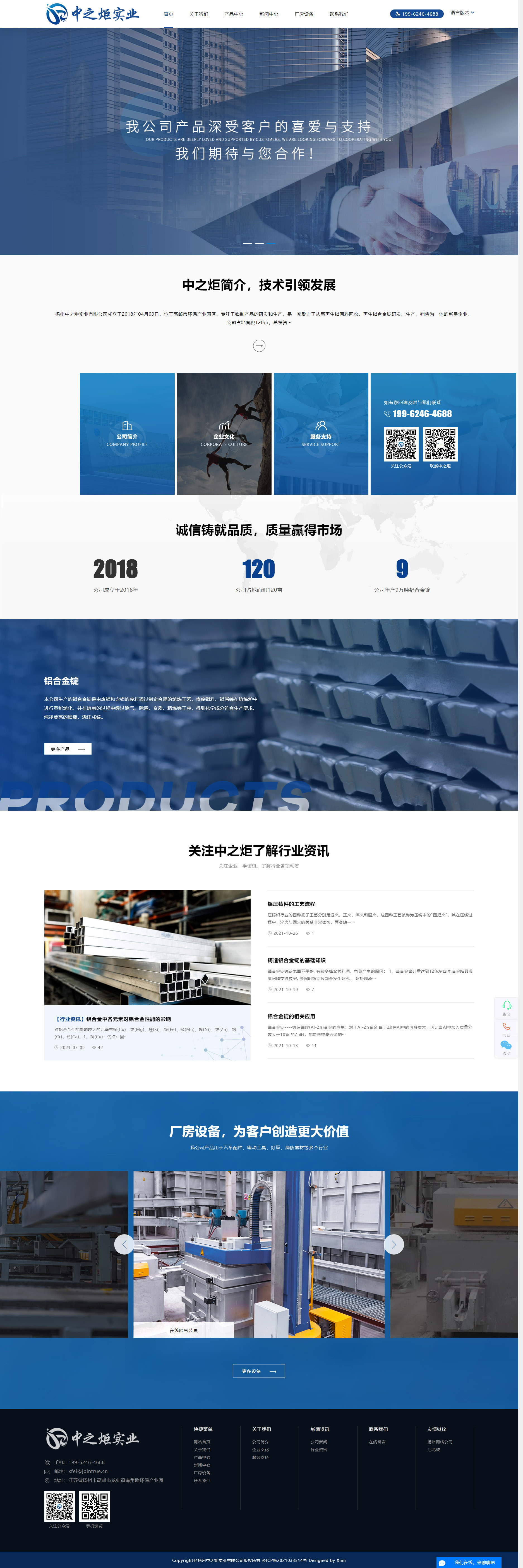 扬州中之炬实业有限公司成立于2018年04月09日,位于高邮市环保产业园区,专注于铝制产品的研发和生产,是一家致力于从事再生铝原料回收,再生铝合金锭研发、生产、销售为一体的新星企业。公司占地面积120亩,总投资10亿元。