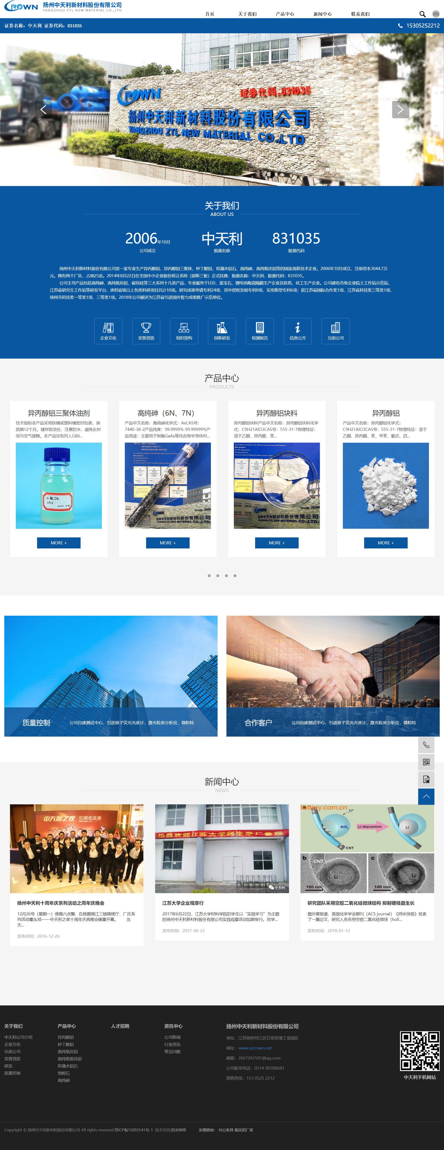 扬州中天利新材料股份有限公司是一家专业生产异丙醇铝、异丙醇铝三聚体、仲丁醇铝、拟薄水铝石、高纯砷、高纯氧化铝等的国家高新技术企业。2006年10月成立,注册资本3044.7万元。拥有两个厂区,一个位于江苏省扬州市邗江区甘泉双塘工业集中区,占地28亩;一个位于维扬经济技术开发区科技园路,占地25亩。