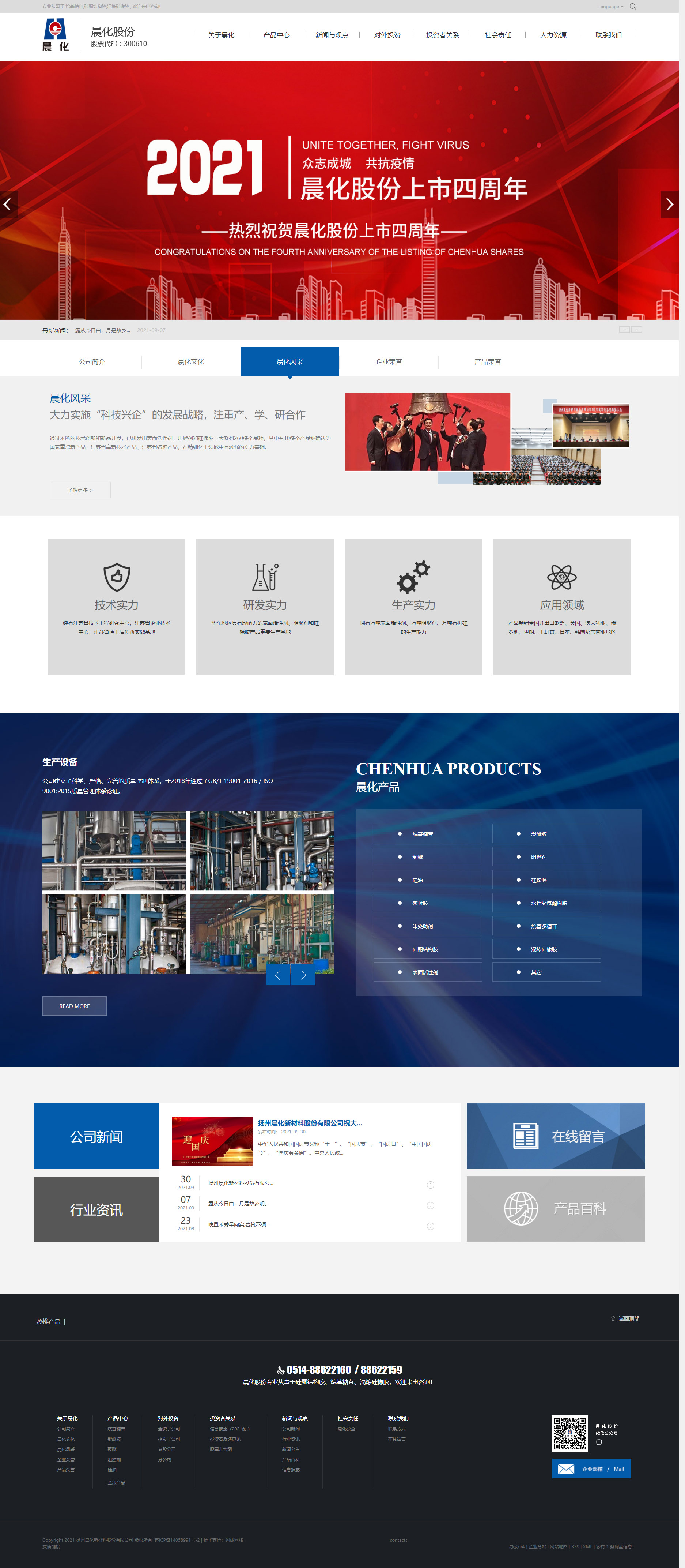 扬州晨化新材料股份有限公司(以下简称:公司)创建于1995年,坐落于扬州市宝应县曹甸镇工业园区,注册资本15067.3万元。是一家集科研、中试、生产、销售为一体的国家高新技术企业。是华东地区具有影响力的表面活性剂、阻燃剂和硅橡胶产品重要生产基地,产品畅销全国20多个省、市、自治区,并出口欧盟、美国、澳大利亚、俄罗斯、土耳其、日本、韩国及东南亚地区。